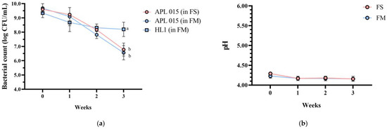 Importantly, product stability was good after 3 weeks of storage at 4 °C. No syneresis or texture breakdown was observed, and probiotic counts remained above 108 CFU/mL (Figure 3). Overall, the co-culture product FM achieved the desired technological properties (rapid fermentation, thick consistency, appealing sensory profile) while successfully delivering a high dose of viable HL1.