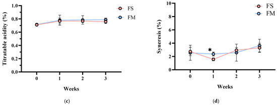 Changes in (a) bacterial count, (b) pH value, (c) TA, and (d) syneresis of different fermented milk products during storage stability test period for 3 weeks. FS, Lc. lactis subsp. cremoris APL015 fermented milk; FM, mix of Lb. kefiranofaciens HL1 and Lc. lactis subsp. cremoris APL015 fermented milk. Asterisks (*) indicate significant differences between different products at each time point (p < 0.05), while different letters (a, b) indicate significant differences among samples within the same time point (p < 0.05). Data are shown as mean ± SD (n = 3).