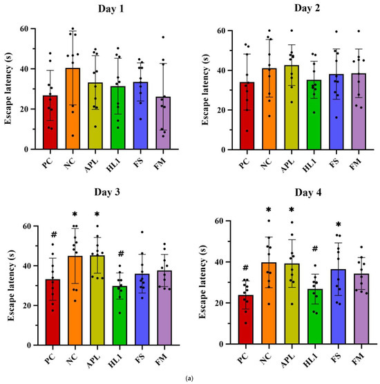 Chronic D-galactose administration induced marked behavioral impairments in the NC group, while mice treated with fermented milk (FM) or the probiotic strain HL1 showed significant cognitive improvements. In the Morris water maze test (Figure 4a), D-gal exposure severely disrupted spatial learning, as evidenced by longer swim paths and increased escape latencies during training in the NC group. In contrast, healthy control (PC) mice rapidly learned to locate the hidden platform. By day 4, mice in the HL1 group exhibited significantly shorter escape latencies than NC mice (p < 0.05), indicating enhanced spatial learning. The FM group also showed reduced latencies, comparable to HL1, although the difference between the two was not statistically significant. Mice in the APL015 (APL) and FS groups performed similarly to those in the NC group, with no significant improvement.