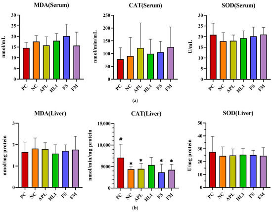 The activities of CAT and SOD and the levels of MDA in (a) serum, (b) liver, and (c) brain. PC, positive control; NC, D-galactose-induced aging mice; APL, induced aging mice administered Lc. lactis subsp. cremoris APL015; HL1, induced aging mice administered Lb. kefiranofaciens HL1; FS, induced aging mice administered Lc. lactis subsp. cremoris APL015 fermented milk; FM, induced aging mice administered Lb. kefiranofaciens HL1 and Lc. lactis subsp. cremoris APL015 fermented milk. * indicates significant difference from PC (p < 0.05). # indicates significant difference from NC (p < 0.05). Data are shown as mean ± SD (n = 9–10 mice per group). Data were analyzed Via the Kruskal–Wallis test followed by Dunn’s multiple comparisons test.