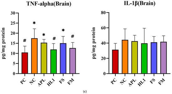 The inflammatory response paralleled the oxidative stress pattern. NC mice displayed significantly elevated serum levels of pro-inflammatory cytokines TNF-α and IL-1β, indicative of systemic inflammation (Figure 6a). Treatment with HL1 or FM significantly reduced both cytokines (p < 0.05 vs. NC), restoring them toward levels observed in the PC group. In contrast, APL and FS failed to significantly reduce serum IL-1β. Hepatic TNF-α levels were also significantly increased in NC mice, and all treatment groups (APL, HL1, FS, and FM) achieved a significant reduction in this marker (p < 0.05 vs. NC), indicating that each intervention conferred some peripheral anti-inflammatory effect (Figure 6b). In the brain, neuroinflammation was most evident in the hippocampus, where D-galactose markedly increased TNF-α expression. Only the HL1 and FM treatments significantly attenuated this elevation (p < 0.05 vs. NC), demonstrating their neuroprotective potential (Figure 6c). Neither APL nor FS exerted a detectable effect on hippocampal cytokine levels, underscoring that the anti-inflammatory and neuroprotective actions were specific to interventions containing HL1.