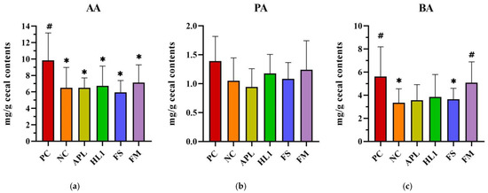 Analysis of short-chain fatty acids (SCFAs) in cecal contents: (a) acetic acid (AA), (b) propionic acid (PA), and (c) butyric acid (BA). PC, positive control; NC, D-galactose-induced aging mice; APL, aging mice administered Lc. lactis subsp. cremoris APL015; HL1, aging mice administered Lb. kefiranofaciens HL1; FS, aging mice administered APL015 fermented milk; FM, aging mice administered HL1 and APL015 co-fermented milk. Elevated SCFA levels, particularly butyrate, are associated with improved gut health and reduced inflammation. # indicates significant differences compared to NC (p < 0.05). and * indicates significant differences compared to PC (p < 0.05). Data are presented as mean ± SD (n = 8–10 mice per group). Statistical analysis was performed using the Kruskal–Wallis test followed by Dunn’s multiple comparisons test.