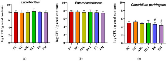 Analysis of cecal bacterial populations: (a) Lactobacillus, (b) Enterobacteriaceae, and (c) Clostridium perfringens counts (log CFU/g cecal contents). PC, positive control; NC, D-galactose-induced aging mice; APL, aging mice administered Lc. lactis APL015; HL1, aging mice administered Lb. kefiranofaciens HL1; FS, aging mice administered APL015 fermented milk; FM, aging mice administered HL1 + APL015 co-fermented milk. Suppression of C. perfringens and maintenance of Lactobacillus populations are indicators of improved gut microbiota composition and health status. Data are expressed as mean ± SD (n = 10 per group). Superscript symbol (#) indicate significant differences (p < 0.05) compared to NC. Data were analyzed via the Kruskal–Wallis test followed by Dunn’s multiple comparisons test.