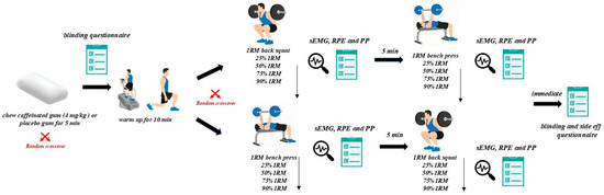 For the experimental session, upon arrival at the laboratory, participants performed a standardized 10-min warm-up, which comprised 5 min of self-selected cycling on an ergometer followed by 5 min of joint mobilization and dynamic stretching exercises. Subsequently, participants chewed either caffeinated or placebo gum for 5 min while sEMG electrodes were affixed. The testing protocol (Figure 1) began with measuring 1RM, followed by muscular power measurements at incremental loads (25%, 50%, 75%, and 90% 1RM) during bench press and back squat exercises. The order of the exercises was counterbalanced across participants and remained consistent for each individual during both sessions, using randomization software (Excel, Microsoft, WA, USA). Two experienced personal trainers ensured proper technique adherence during the exercises [35]. Participants were prohibited from wearing weightlifting belts, bench shirts, or other supportive garments during testing.