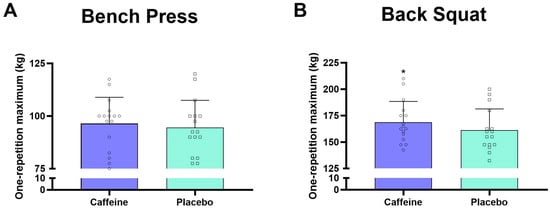 Recent reviews have suggested that caffeine may have larger effects on muscular power than on maximal strength (1RM) during resistance exercise [29,30]. Our results support this, showing that the effect sizes (d) for both mean and peak velocity were larger than for 1RM in both the bench press (0.25–0.62 vs. 0.11) and back squat (0.54–0.86 vs. 0.39) exercises. This may be because the load during muscular power tests is lower than during maximal strength tests, allowing for greater potential improvements in motor unit recruitment. Further supporting this, caffeine enhanced the RMS activity of the gluteus maximus at 25–75% of 1RM, but did not increase the RMS of any muscle at 90% 1RM or during maximal strength tests. Additionally, previous studies on the effects of caffeine on muscular power during bench press and back squat at varying loads (25–90% 1RM) typically used 1RM values measured before caffeine ingestion (i.e., pre-experimental session) [14,15]. However, both our study and prior research [60] show that caffeine can significantly increase 1RM, which may lower the relative load during muscular power tests. Therefore, it is important to explore whether the effects of caffeine on muscular power at different loads are mediated by its impact on 1RM. Our results (Figure A1) show that caffeine significantly enhances MV and PV at 25–50% 1RM measured both pre- and post-ingestion. Overall, this suggests that the performance-enhancing effects of caffeine on muscular power during bench press and back squat are not mediated by improvements in 1RM.