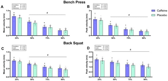 Mean and peak velocity in the bench press (A,B) and back squat (C,D). Error bars represent standard deviation. * p < 0.05 vs. placebo, # p < 0.05 vs. 25% 1RM.