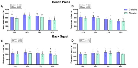 Mean and peak power output in the bench press (A,B) and back squat (C,D). Error bars represent standard deviation. * p < 0.05 vs. placebo.