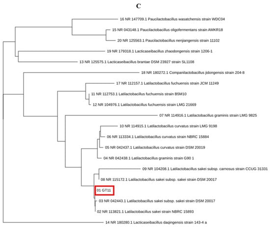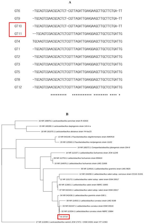 Phylogenetic analysis of lactic acid bacteria isolated from GRET based on 16S rDNA sequences. The 16S rDNA sequences of twelve strains (A) were determined and deposited (19 January 2025) in the Korea Biological Resource Center (Accession number: KCTC19209P) and a BLAST search (http://www.ncbi.nlm.nih.gov/BLAST/) was performed to compare the homology using CLUSTAL O (1.2.4) multiple sequence alignment software, as described in previous studies [41,42,43]. Phylogenetic analysis was conducted on all twelve strains, but considering the importance of lactic acid production, only GT10 (B) and GT11 (C) were selected for further study. The red box in the figure marks the microorganisms isolated in this study. “*” marks the bases that are important for homology comparison and indicates the conserved domain of the 16S rDNA of the corresponding microorganism.