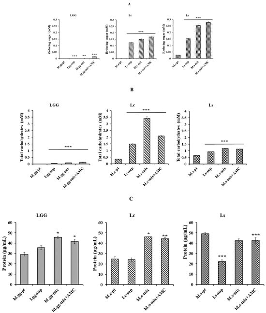 To clarify the biochemical characteristics of the newly isolated strains in this study, an experiment was performed to confirm the composition of the metabolites of the strains. Total carbohydrate, reducing sugar, and protein quantification were performed according to previously described methods. The extracellular metabolites, according to the microbial culture of standard strains LGG, Lc, and Ls using selective media, were abbreviated as Lgg-sup, Lc-sup, and Ls-sup, respectively. After centrifugation (13,000 rpm, 5 min), each cultured cell was washed with PBS (pH 7.0) and suspended in MRS medium. After heat treatment, they were abbreviated as hLgg-pt, hLc-pt, and hLs-pt. Finally, the mixtures of extracellular metabolites and cells were abbreviated as hLgg-mix, hLc-mix, and hLs-mix, respectively. The results of the analysis of reducing sugar, total carbohydrate, and protein contents in each sample are presented (Figure 2A). As a result of the analysis of the supernatant components containing the metabolites excreted outside the cells, the total carbohydrate and reducing sugar contents were detected at higher levels than those of the control group, LGG. The concentration of reducing sugar in the Lc mixture (hLc-mix), i.e., including heat-treated dead cells, was measured to be 0.123 mM, total carbohydrate was 3.412 mM, and protein was 18.50 μg/mL. In contrast, the reduced sugar in Ls (hLs-mix), i.e., including heat-treated dead cells, was measured to be 0.254 mM, total carbohydrate was 1.175 mM, and protein was 19.84 μg/mL, respectively (Figure 2B). The reducing sugar and carbohydrate contents in both strains were detected to be higher than those in LGG, which was used as a control, which is thought to be due to the active metabolic activities of Lc and Ls. However, the protein content did not show a significant difference between the three strains and was evaluated at a similar level to LGG (Figure 2C).