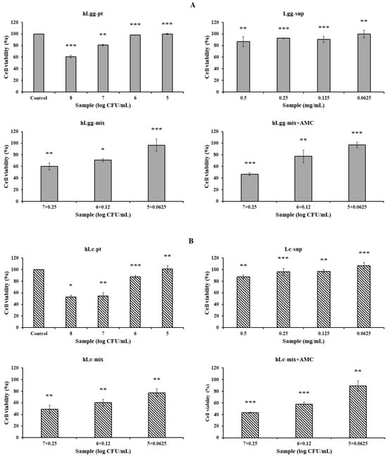 The culture supernatant containing the control LGG and the metabolites of LC and Ls, and the precipitates obtained by centrifugation at 13,000 rpm for 5 min after heat treatment of each sample were designated as hLgg-pt, hLc-pt, and hLs-pt, respectively. The cytotoxicity of the culture supernatant (LGG, Lc, and Ls) and the heat-treated cell mixture was evaluated. The evaluation criterion was that the concentration at which cell viability was maintained at 90% or higher was considered non-cytotoxic. As a result, in the case of LGG, hLgg-pt was evaluated as not cytotoxic with a cell viability of over 90% at a concentration of 106 CFU/mL. Lgg-sup also did not induce cytotoxicity at concentrations below 0.25 mg/mL. In these combined treatment groups (hLgg-pt + Lgg-sup), the cell viability was maintained at over 90% when treated with 105 CFU/mL, indicating that no significant cytotoxicity was observed in either the single treatment or the combined treatment. However, when treated with 108 CFU/mL, it was confirmed that the cell viability decreased by approximately 40% (Figure 3A). Similar to this result, it can be interpreted that the degree of cytotoxicity was somewhat lower than that of the control group when each sample of Lc and Ls was treated at the same concentration (Figure 3B,C). Based on these results, we concluded that the cytotoxicity of metabolites or cells of the control groups LGG, Lc, and Ls was not significant. More specifically, similar effects were observed in Lc, showing a similar level of cell safety to the LGG-treated group. On the other hand, Ls showed the characteristic of maintaining cell viability up to a higher concentration range under complex treatment conditions. Therefore, it suggests that the stability of Ls metabolites or cells themselves is relatively high. This suggests that lactic acid bacteria-derived macromolecules or cells themselves can be safely applied to food, feed, and various biological applications. In particular, it shows that using metabolites and heat-treated cells themselves as a biomass mixture does not induce cytotoxicity but rather improves functionality. One interesting point is that very similar results were maintained regardless of whether AMC was added or not. AMC has been reported to have very significant biological activities, such as anti-inflammatory, antimicrobial, and antioxidant activities, and by adding it, inhibition of metabolite degeneration and food preservation effects can also be expected.