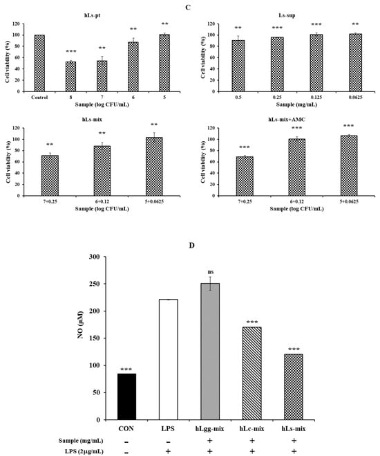 Cytotoxicity evaluation of cell metabolites and dead cells against macrophage RAW264.7. The cytotoxicity of the culture products of three types of lactic acid bacteria, LGG (A), Lc (B), and Ls (C), heat-treated dead cells, and their mixtures was evaluated to determine whether they can be used as prebiotics or probiotics. To evaluate anti-inflammatory activity, NO productivity was evaluated using LPS as a treatment control (D). Also, to expect their stability and synergistic effect, the cytotoxicity and bioactivity were verified by adding active molecular chitosan (AMC), as described in Figure 2. Statistical probability compared to the control group is also indicated (p-value, ***, 0.001; **, 0.05; *, 0.1).