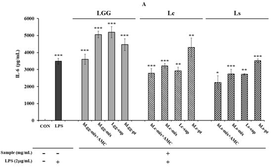Inducible nitric oxide synthase (iNOS or NOS II) is expressed at high levels only after induction by cytokines or other inflammatory factors. Overproduction of NO is associated with various inflammatory diseases, making it commonly used to screen for active substances that can modulate this pathway. The production of NO induced by lipopolysaccharide (LPS) in RAW264.7 cells was quantitatively evaluated. After LPS (2 µg/mL) treatment, NO production significantly increased. However, the inhibitory effects of the control group LGG and the metabolites of two types of lactic acid bacteria, Lc and Ls, and the cells themselves on NO production were not significant in RAW264.7 macrophages induced by LPS (Figure 3D). NO is a signal processor independent of various physiological activities, and its dysregulation is related to life span. Therefore, biological materials that reduce NO production by using specific inhibitors of inducible NO synthase may be of great help in improving various diseases. However, Ls or Lc used in this study did not show significant inhibitory activity regardless of the presence of AMC. This means that the enzymatic activity of iNOS, which is responsible for intracellular NO production, significantly increased after LPS treatment, but the cultured products of LGG, Ls, and Lc, or the heat-inactivated cell bodies themselves, did not inhibit the enzymatic activity of iNOS induced by LPS.