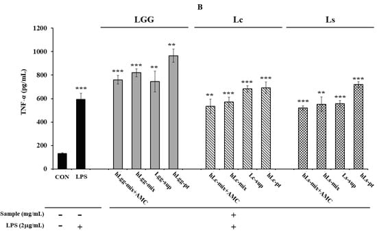 On the other hand, after inducing an inflammatory response by treating RAW264.7 macrophages with LPS (2 μg/mL), the effects of heat-treated lactic acid bacteria or culture metabolites on the secretion of other major inflammatory cytokines, IL-6 (Figure 4A) and TNF-α (Figure 4B), were evaluated. When LGG was used as a control, and the metabolites, heat-treated cells, and mixtures of Lc and LS, which were lactic acid bacteria isolated in this study, were treated, it was confirmed that the amount of TNF-α secretion was significantly reduced compared to that following LGG treatment. Like the effect of reducing TNF-α secretion, a similar trend was observed in the reduction in IL-6 secretion or expression. The overall results showed that the metabolites derived from Lc and Ls, and the heat-treated cells, showed a significant inhibitory effect compared to the LGG-treated group. However, in the group treated with a mixture of metabolites and heat-treated dead cells, no significant reduction effect was observed compared to the LPS-treated control group. However, it was shown to be similar to or slightly lower than that of the LGG-treated group. These results probably suggest the need for precise concentration control to evaluate the concentration-dependent anti-inflammatory effect.