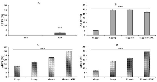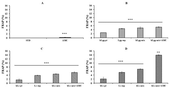 Furthermore, the antioxidant activity of LGG, Lc, and Ls was evaluated based on the reducing power using FRAP analysis (Figure 6). It was performed under the same conditions as the ABTS radical scavenging activity test. Both LGG and Lc treatment groups showed similar FRAP activities depending on the selected sample conditions (Figure 6B,C). On the other hand, in the Ls treatment group, especially the combined treatment group with AMC, showed about 2–12% higher activity compared to the other samples (Figure 6D). These results suggest that Ls (Ls-sup and hLs-pt) have significant antioxidant activity against FRAP, and combined treatment with AMC can be expected to have a more excellent synergistic effect. It is thought that the synergistic effect is due to the chemical structural stability of AMC, its affinity with other compounds, and its binding stability. To supplement the additional significance of the addition of AMC, the concentration-dependent antioxidant, antibacterial, and excellent anti-inflammatory effects of AMC itself were verified [44,45,46]. Therefore, since the combined effect with AMC is greatly expected, it is thought that there is a high possibility that it will be used as a material for the development of functional foods or pet feed.