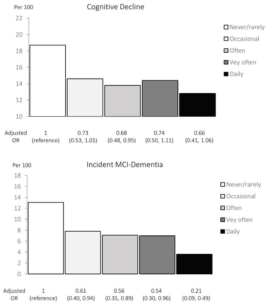 Among the 2446 participants who were cognitively normal at baseline, an increasing level of curry consumption was inversely associated with the development of incident MCI-dementia, p for linear trend < 0.001. (Table 2) The cumulative incidence of MCI-dementia decreased from 13.1% in those who never or rarely consumed curry to 3.6% in those who daily consumed curry (Table 4 and Figure 2). Controlling for the influence of baseline confounders, the adjusted OR across increasing levels of curry consumption exhibited a linear trend (p = 0.021), OR = 0.61 (p < 0.05) for occasional consumption compared with OR = 0.21 (p < 0.001) for daily consumption.