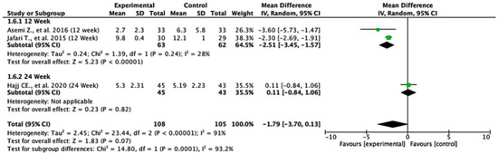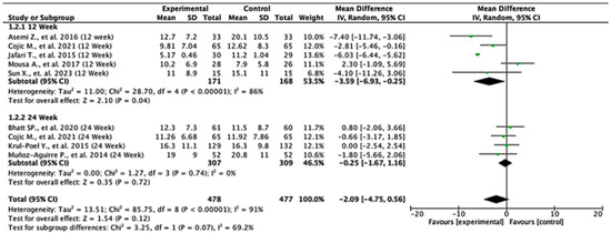 In the 12-week follow-up subgroup, the pooled mean difference was −3.59 units (95% CI: −6.93 to −0.25; p = 0.04), indicating a statistically significant reduction in insulin levels favoring the experimental intervention. This suggests a modest short-term benefit. However, no significant effect was observed in the 24-week subgroup, with a pooled mean difference of −0.25 units (95% CI: −1.67 to 1.16; p = 0.72). The overall pooled analysis across all the studies yielded a mean difference of −2.09 units (95% CI: −4.75 to 0.56; p = 0.12), showing no statistically significant difference between the intervention and control groups. Substantial heterogeneity was present (I2 = 91%), likely due to differences in study design, populations, or intervention protocols. The test for subgroup differences between the 12-week and 24-week groups was not statistically significant (p = 0.07), suggesting that follow-up duration alone does not explain the observed variability in treatment effect. These findings indicate potential early benefits that may not be sustained over time, highlighting the need for further high-quality studies to clarify the long-term effects of the intervention on insulin levels (Figure 3).