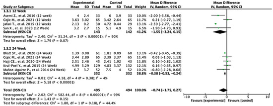 Among the studies reporting HOMA-IR outcomes, the treatment effects varied across follow-up durations. At 12 weeks, the pooled mean difference was −1.55 (95% CI: −3.24 to 0.15; p = 0.07), indicating no statistically significant difference between the groups. In contrast, at 24 weeks, the pooled mean difference was −0.38 (95% CI: −0.53 to −0.24; p < 0.00001), demonstrating a significant reduction in HOMA-IR in favor of the experimental group. When all the studies were combined, the overall pooled mean difference was −0.74 (95% CI: −1.75 to 0.27; p = 0.15), suggesting no statistically significant difference overall. Moderate heterogeneity was observed (I2 = 59%), indicating variability between study results. The test for subgroup differences between 12- and 24-week follow-ups was not statistically significant (p = 0.18), suggesting that follow-up duration did not significantly modify the treatment effect (Figure 4).