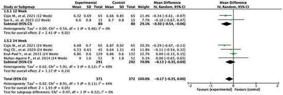 Among the studies reporting HbA1c outcomes, the treatment effects varied between follow-up durations. At 12 weeks, the pooled mean difference was −0.30 (95% CI: −0.54 to −0.06; p = 0.02), indicating a statistically significant reduction in HbA1c favoring the experimental group. At 24 weeks, the pooled mean difference was −0.13 (95% CI: −0.35 to 0.09; p = 0.24), showing no significant difference between the groups. When all the studies were combined, the overall pooled mean difference was −0.17 (95% CI: −0.35 to 0.00; p = 0.05), suggesting a borderline effect favoring the experimental treatment. Moderate heterogeneity was observed (I2 = 44%), indicating some variability across the studies. The test for subgroup differences by follow-up duration was not statistically significant (p = 0.32), suggesting that treatment effect was not dependent on follow-up time (Figure 6).