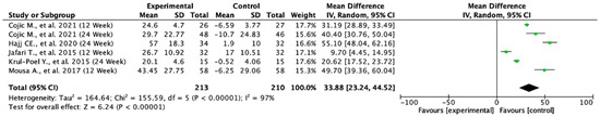 Forest plot for the mean difference from baseline of serum vitamin D. All studies shown are referenced as: Cojic M., et al., (2021), Hajj CE., et al., (2020), Jafari T., et al., (2015), Krul-Poel Y., et al., (2015), Mousa A., et al., (2017) [20,27,28,30,32].