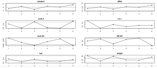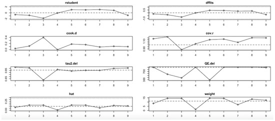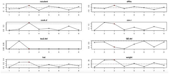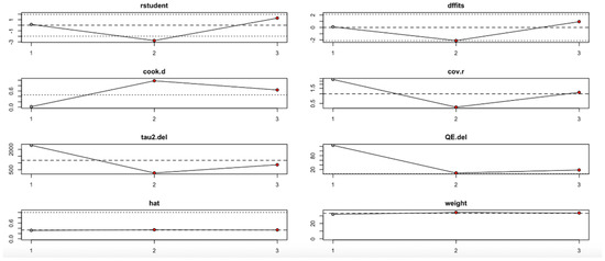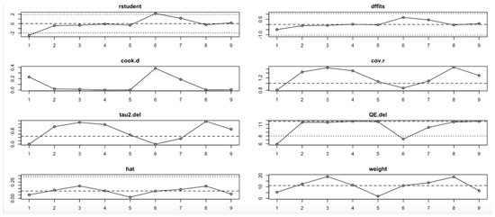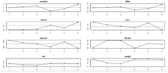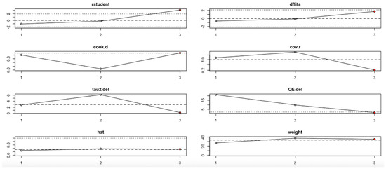 For FPG (Figure 9, Table 4), heterogeneity was moderate to high, with I2 values fluctuating between approximately 42.7% and 90.9% across iterations. Notably, omitting certain studies led to reductions in heterogeneity, but the pooled effect estimates remained relatively consistent. The third study exerted a notable influence, as indicated by elevated values in studentized residuals, Cook’s distance, DFFITS, and hat diagnostics, suggesting some sensitivity to that study. However, the overall statistical conclusions were robust.