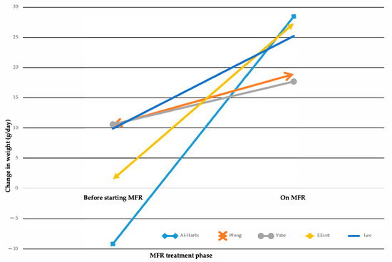 MFR demonstrates varying degrees of improvement in post-operative nutritional biomarkers (Supplementary Materials Table S6). Analysis of mean weight gain showed significant differences between groups (Figure 2) [1,18,23,24,33].
