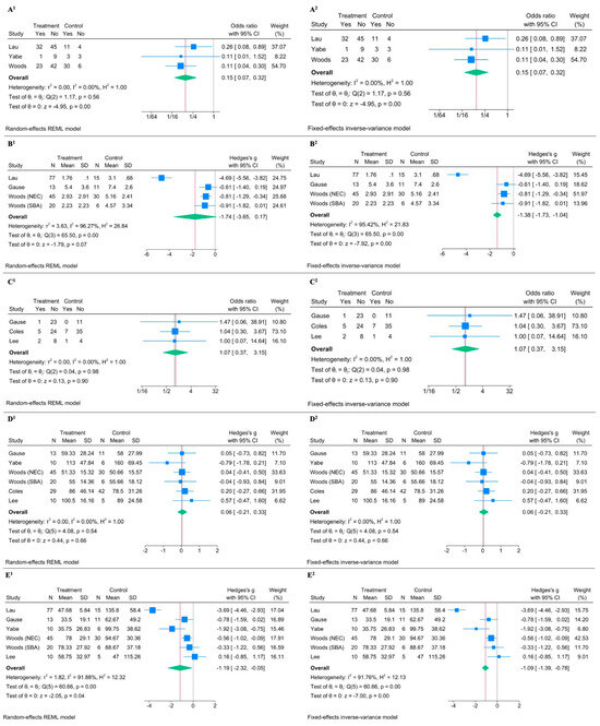 Meta-analysis regarding cholestasis showed a significant reduction in the MFR group with an OR of 0.151 with a 95% CI of 0.071 to 0.319, and a p-value < 0.0001 in the random-effects model (Figure 3(A1)) [18,21,31]. The fixed-effects model provided similar results (Figure 3(A2)). The low heterogeneity (I2 = 0.00%) further supported the consistency of the effect across studies. The effect of MFR on peak bilirubin levels showed heterogeneous results (I2 = 96.27%) [21,28,31]. While the random-effects model gave an effect size (Hedges’s g) of −1.742 with a 95% CI of −3.651 to 0.166 and a p-value of 0.0736 (indicating a non-significant result), the fixed-effects model showed a significant effect (effect size of −1.385 and a 95% CI of −1.728 to −1.042, with a p-value < 0.0001) (Figure 3(B1,B2)). Regarding catheter-related sepsis, the meta-analysis suggested no significant effect: the random-effects model yielded an OR of 1.074 with a 95% CI of 0.366 to 3.153 and a p-value of 0.8968, and the fixed-effects model showed similar OR and CI values (Figure 3(C1,C2)) [28,32,33]. The high p-value for heterogeneity (Q = 0.04, p = 0.9802) suggested no significant variation among the studies. No significant effect was found on the time for BCR in both random-effects and fixed-effects meta-analysis (Figure 3(D1,D2)) [18,28,31,32,33]. PN duration analysis suggested a significant reduction in PN duration with MFR, despite significant heterogeneity given by one outlier (I2 = 91.88%) [18,21,28,31,33]. The random-effects model showed an effect size (Hedges’s g) of −1.187 with a 95% CI of −2.323 to −0.051 and a p-value of 0.0405 (Figure 3(E1)), and the fixed-effects model confirmed a significant effect size of −1.085 with a 95% CI of −1.389 to −0.781 and a p-value of 0.0000 (Figure 3(E2)).