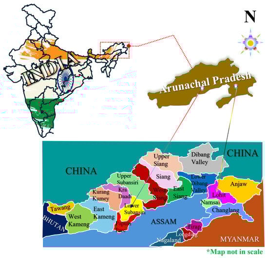 The Himalayan Mountain Region (HMR) is extended from 15.95° to 39.31° N latitude and 60.85° to 105.04° E longitude across eight South Asian countries: Afghanistan, Bangladesh, Bhutan, China, India, Myanmar, Nepal, and Pakistan [,]. It is extended around 3000 km in length and 250–300 km in width, with a geographical area of around 7,550,000 km2 []. Around 70% of the people continue agriculture-based livelihoods [,] and the maximum number of people are maintaining homestead gardens. Out of the eight countries, India borders all the other countries. Accordingly, India and one of its states (Arunachal Pradesh) under the HMR were selected for the present study.