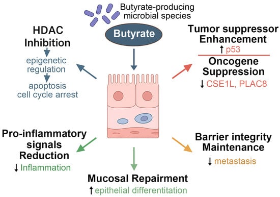 Among SCFAs, butyrate stands out for its multifaced anti-cancer properties [124]. Particularly in the context of CRC, substantial research has explored butyrate’s roles in intestinal homeostasis, mucosal health, the regulation of inflammation, and tumor suppression [125].