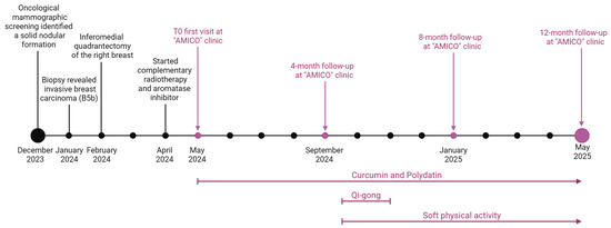 The patient’s timeline indicates the year and month of diagnosis, surgical and therapeutic management, “AMICO” clinic follow-up times (vertical bars and arrows above the timeline), and integrative therapies (vertical arrows and bars below the timeline). Created at https://BioRender.com by Mecca, M. (accessed on 22 May 2025).