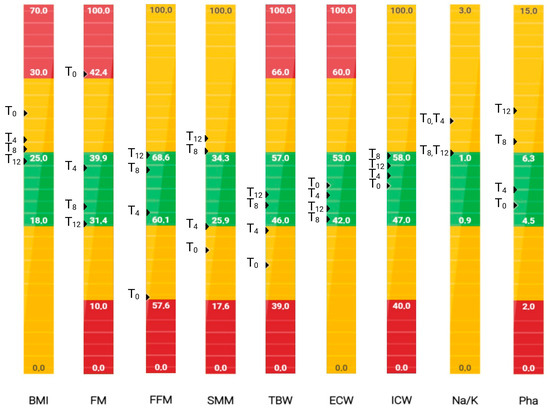 Patient graphical representation of body composition parameters obtained by bioelectrical impedance analysis (BIA) at T0, 4 months (T4), 8 months (T8), and 12 months (T12). The results are colour-coded according to clinical relevance: green indicates values within the normal physiological range, yellow indicates mildly altered values, and red indicates severely pathological values. Created at https://BioRender.com by Mecca, M. (accessed on 17 June 2025).