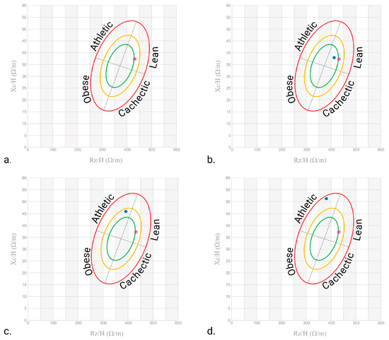 Patient bioelectrical phase angle and impedance vector analysis at (a) T0, (b) 4 months, (c) 8 months, and (d) 12 months. The red dots indicate the initial measurement (T0), whereas the blue dots indicate the follow-up measurements. The ellipses delineate the reference tolerances (50%, 75%, and 95%) for different body composition categories (Obese, Cachectic, Lean, and Athletic). Created at https://BioRender.com by Mecca, M. (accessed on 10 June 2025).