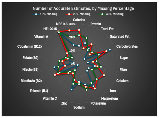 Table 6 and Figure 1 summarize the proportion of imputed values falling within ±10% of the actual values. Accuracy was generally poor. HEI-2015 showed the highest proportion of accurate imputation values (approximately 28%) across all levels of missingness. For nutrients, accuracy rarely exceeded 25%, and in many cases, fewer than 15% of values were within the accuracy threshold. No clear pattern of improved accuracy was observed with less missingness.