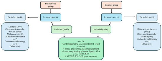 Both groups combined account for a total of 178 participants. All included subjects underwent anthropometric assessments (body mass index and waist-hip ratio), blood pressure and advanced glycation end products (AGE) measurements, laboratory testing (glucose, lipids, AEA, and 2-AG via ELISA), and completed MDSS and IPAQ-SF questionnaires.