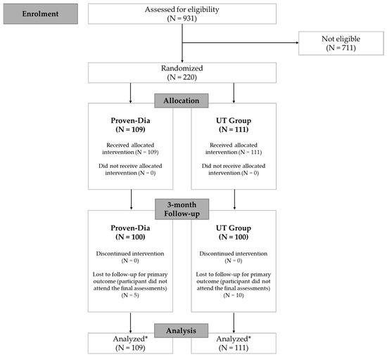 Participants were randomly assigned in a 1:1 ratio to either the intervention group (Proven-Dia) or the control group (usual treatment [UT]) using the study’s centralized web-based system, REDCap®. The allocation sequence was computer-generated using validated software (R statistical software, version 4.2.1), employing block randomization with varying block sizes and stratification by center. Investigators accessed REDCap®, completed the electronic case report form (CRF), and confirmed eligibility criteria before randomization was permitted.