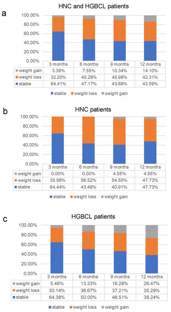 In our retrospective study, we observed clinically relevant weight loss in both HNC and HGBCL patients over the first year following diagnosis. HGBCL patients demonstrated a more favorable trajectory, with many regaining weight, whereas nearly half of the HNC patients failed to return to their baseline weight. Both patterns—persistent weight loss among HNC survivors [] and weight gain following HGBCL treatment—have been previously reported [,].