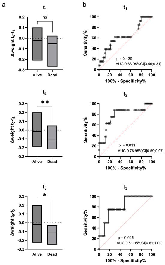 Δweight is a predictor of outcome in high-grade B-cell lymphoma (HGBCL) patients. (a) Plots comparing Δweight of survivors and deceased patients at t1–t3. (b) Receiver Operator Curve (ROC) analysis of the corresponding Δweight time-points. *—p < 0.05, **—p < 0.01.