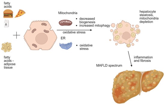 MAFLD genesis. Fatty acids from diet and adipose tissue cause oxidative stress in the ER and mitochondrial dysbiosis in hepatocytes. This leads to inflammation and mitochondrial destruction, which then leads to hepatocyte steatosis and further inflammation, which contributes to the development of the MAFLD spectrum. ER-endoplasmic reticulum; MAFLD–Metabolic dysfunction-associated fatty liver disease. Created in BioRender. Physiology, D. (2025) https://BioRender.com/5ttyj04. access date 25 June 2025.
