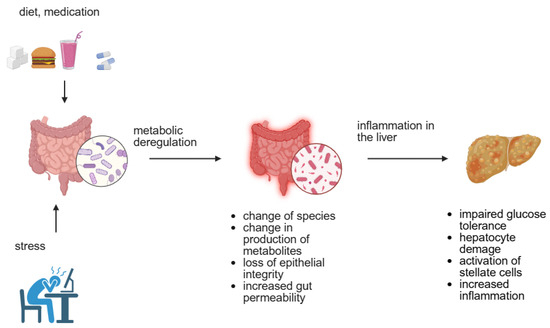 Microbiome dysbiosis. Diet, medication, and stress cause changes in the species composition and production of metabolites in the intestinal flora, leading to the loss of the intestinal barrier and inflammation in the liver. Created in BioRender. Physiology, D. (2025) https://BioRender.com/eno7utk accessed data: 22 July 2025.