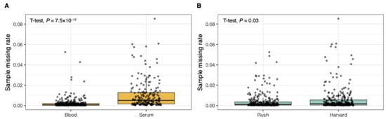 Sample missing rate by specimen type and study site. (A) By specimen type (blood, serum). (B) By study site (Rush University, Harvard University).