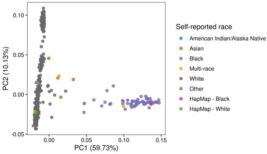 Principal component analysis (PC1 vs. PC2) of genetic data, annotated by self-reported ancestry. Each dot represents an individual (trial participants or HapMap samples), colored according to their self-reported ancestry group. The percentage of variance explained by each PC was annotated on the corresponding axis.