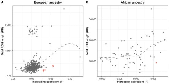 Identification of sample outliers based on heterozygosity and runs of homozygosity (ROH). (A) Among 499 trial samples of inferred European ancestry, five samples (in red) with unusually short ROH relative to their heterozygosity were flagged as outliers based on residuals from a LOESS regression. (B) Among 59 African ancestry samples, one outlier (in red) was identified using the same approach.