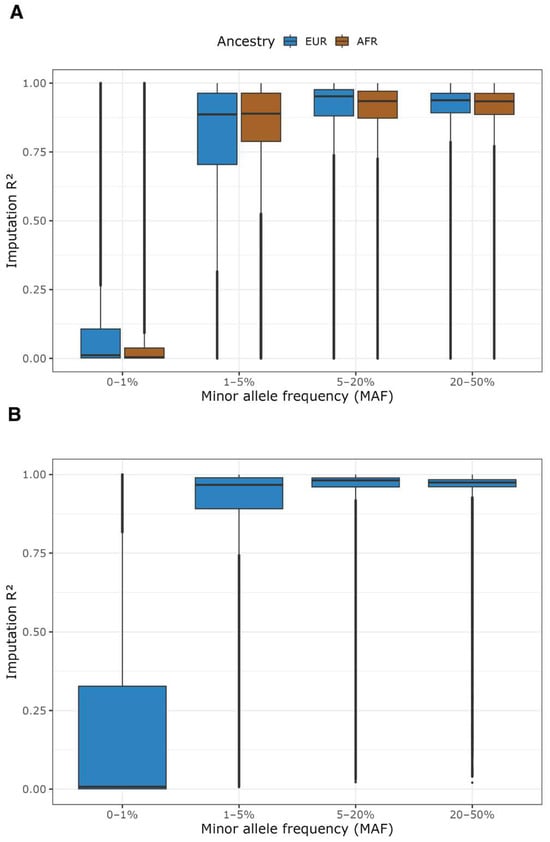 Imputation R2 using the 1000 Genomes Phase 3 v5 (1000G) and Haplotype Reference Consortium (HRC) reference panels. (A) Imputation R2 across minor allele frequency (MAF) bins using the 1000G reference panel in individuals of European (EUR) and African (AFR) ancestry. (B) Imputation R2 across MAF bins using the HRC reference panel in individuals of European (EUR) ancestry.