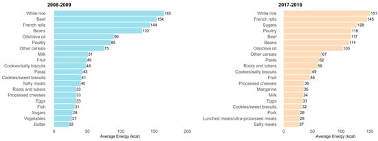 In 2008–2009, the four food subgroups that contributed the most to total daily caloric intake were rice, beef, French rolls, and beans. In the second survey, the leading contributors were rice, French rolls, sugars, and poultry. When comparing the top 20 subgroups contributing to total energy intake in both editions, most were repeated, with the only differences in ranking based on the total number of calories consumed. However, in 2017–2018, two ultra-processed foods (margarine and processed meats/sausages) and one minimally processed item (pork) entered the list of the top 20 subgroups. Meanwhile, vegetables, butter, and fish were no longer among the top 20 contributors in the 2017–2018 edition (Figure 1).