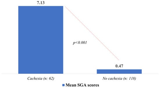 As shown in Figure 1, participants diagnosed with cachexia had higher mean SGA scores, indicating poorer nutritional status.