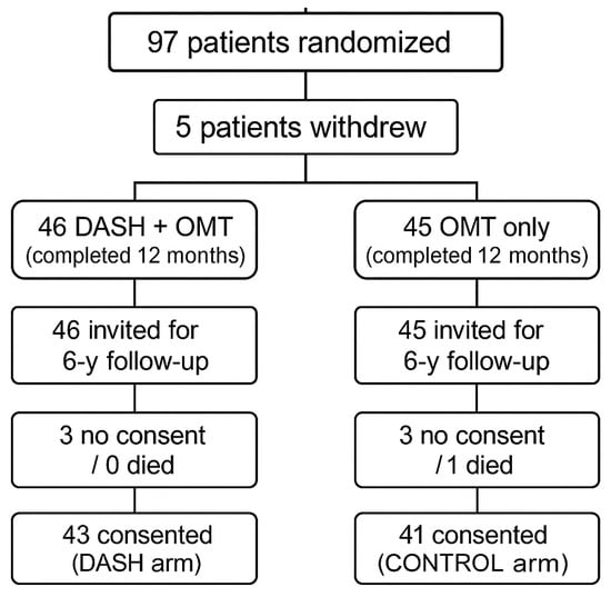 This study is a long-term follow-up of the DISCO-CT randomised controlled trial (NCT02571803), which was originally conducted between 2015 and 2019. The original DISCO-CT study enrolled 97 patients with stable CAD confirmed by coronary computed tomography angiography. The patients were randomised into two groups: a control group that received optimal medical treatment and a study group that received the same treatment plus a 12-month lifestyle intervention based on the DASH diet. The inclusion criteria were as follows: coronary artery atherosclerotic lesions confirmed by CTA (defined as maximum luminal narrowing of less than 70% in at least two coronary artery segments); no indication for coronary angiography or revascularisation; age > 18 years; and informed consent to participate in the study. The following exclusion criteria were applied: valvular heart disease or any other condition requiring cardiac surgery; cardiomyopathy; type 2 diabetes; previous coronary artery bypass graft (CABG) surgery; any known genetic disorders affecting the development of atherosclerotic changes; and any factors that may affect the quality and safety of coronary artery CTA. Dietary counselling was implemented at six visits: at baseline and after one, three, six, nine, and 12 months. The primary results of the original trial, including biochemical, anthropometric, and imaging outcomes, have been published previously [14,18,19].