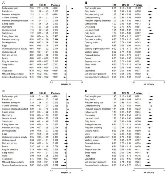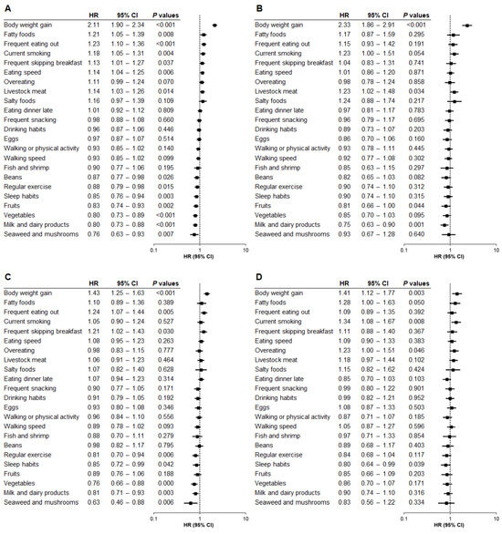 Relationship between questionnaire items and hepatic steatosis by baseline BMI category (Model 2). The association between questionnaire items and the risk of developing hepatic steatosis was analyzed by baseline body mass index (BMI) category using Model 2, adjusted for age, sex, and factors related to metabolic diseases and liver injury. (A) Total population. (B) BMI < 22. (C) BMI 22 to <25. (D) BMI ≥ 25. HR, hazard ratio; CI, confidence interval.