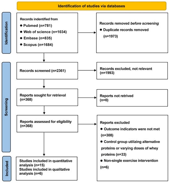 The inclusion and exclusion criteria are outlined in Table 1. The following criteria were used to determine the inclusion of studies in the present analysis: (1) randomized controlled trials (RCTs); (2) written in English; (3) including healthy adults from non-sedentary populations; (4) whey protein supplements (hydrolyzed, concentrated or isolated) were used; (5) an acute, single-bout exercise intervention was performed; (6) MPS rate was assessed by muscle biopsy; and (7) the outcome measures included myofibrillar fractional synthetic rate (FSR) or phosphorylation levels of signaling pathway proteins related to MPS. The following types of literature will not be considered: (1) observational studies and review articles; (2) book chapters, conference abstracts, editorials, letters, and symposium materials; (3) studies involving non-human subjects; and (4) studies reporting on the effects of whey protein on other biological or physiological processes or diseases.