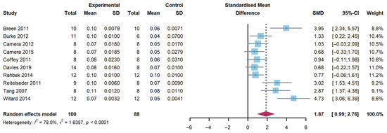 A total of 10 studies were included in the evaluation of the effect of whey protein supplementation on myofibrillar FSR, with measurements taken 3 to 5 h post-exercise. The findings demonstrated that the combination of exercise and whey protein supplementation resulted in a significant increase in myofibrillar FSR compared to exercise alone (Hedge’s g of 1.87; 95% CI: 0.99 to 2.76; p < 0.001). The heterogeneity (I2) statistic was 78.0% (Figure 2).