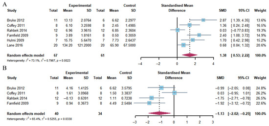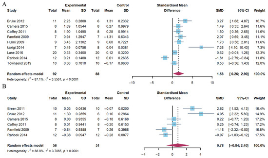 Effects on p70S6K phosphorylation at 1–2 h (A) and 4–5 h (B) post-exercise [17,18,20,21,23,24,25,26,27,30].