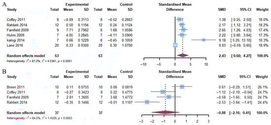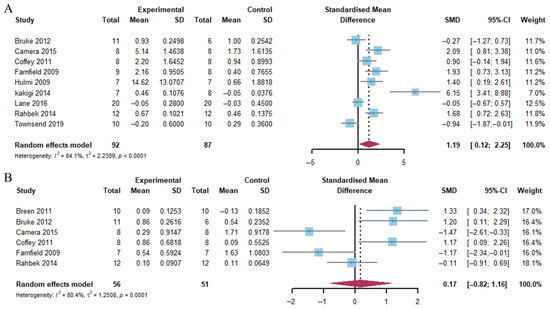 Effects on AKT phosphorylation at 1–2 h (A) and 4–5 h (B) post-exercise [17,18,20,21,23,24,25,26,27,29].
